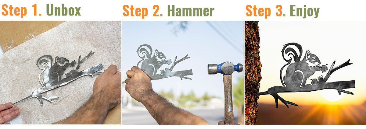 Your Shadow Bird can be placed in your favorite tree, in a post for every new visitor to see, or even against a wall in your home. With your favorite bird in hand, you can be the artist as you set the perfect scene! Once you’ve found the perfect spot, simply grab a hammer and tap it in! As a quick tip, if the wood seems a bit hard, drill a small hole first. For more quick tips, be sure to sign up for our email list!